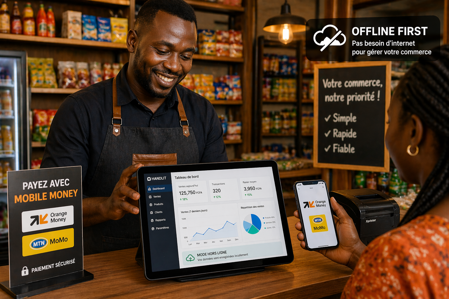 Découvrez HANDLIT POS au Cameroun : une solution offline, compatible Mobile Money (MTN MoMo, Orange Money) avec dashboard en temps réel.